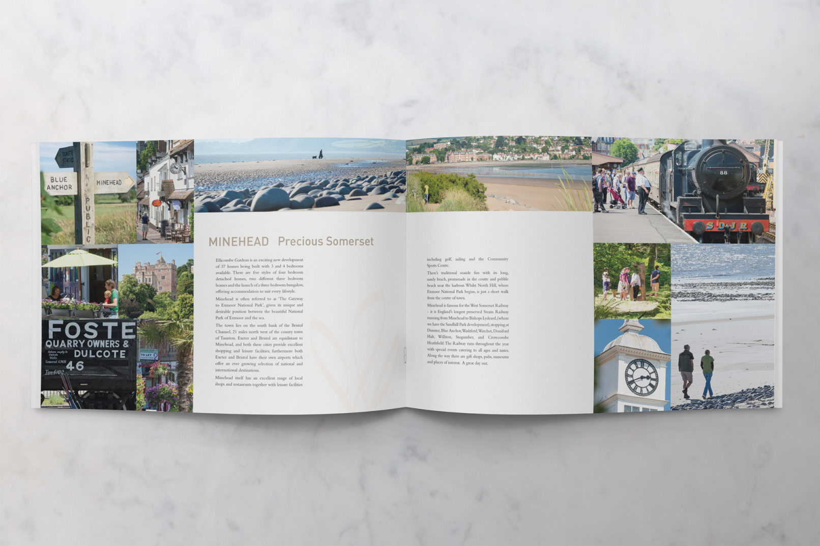 Minehead is the home for Ellicombe Gardens, a residential site by Strongvox Homes. Well thought through branding within this sales brochure, representative of the environment and location.